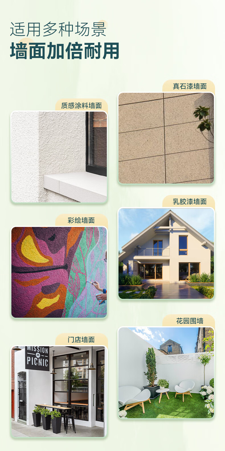 适用于质感涂料墙面,真石漆墙面,彩绘墙面,乳胶漆墙面,门店墙面,花园围墙等墙面