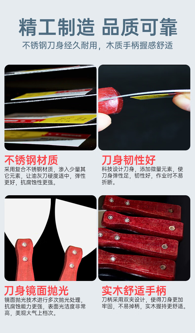 镜面不锈钢,弹性不锈钢刀片,防脱落结构设计,木质手柄,弹性韧性强,硬度高,不易断